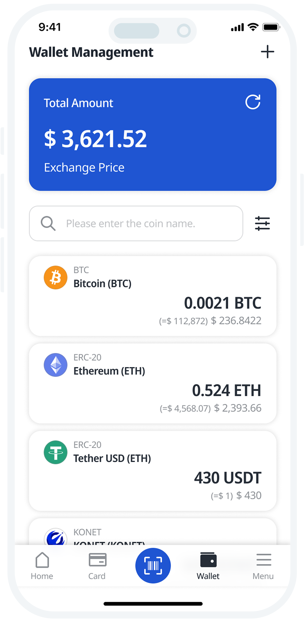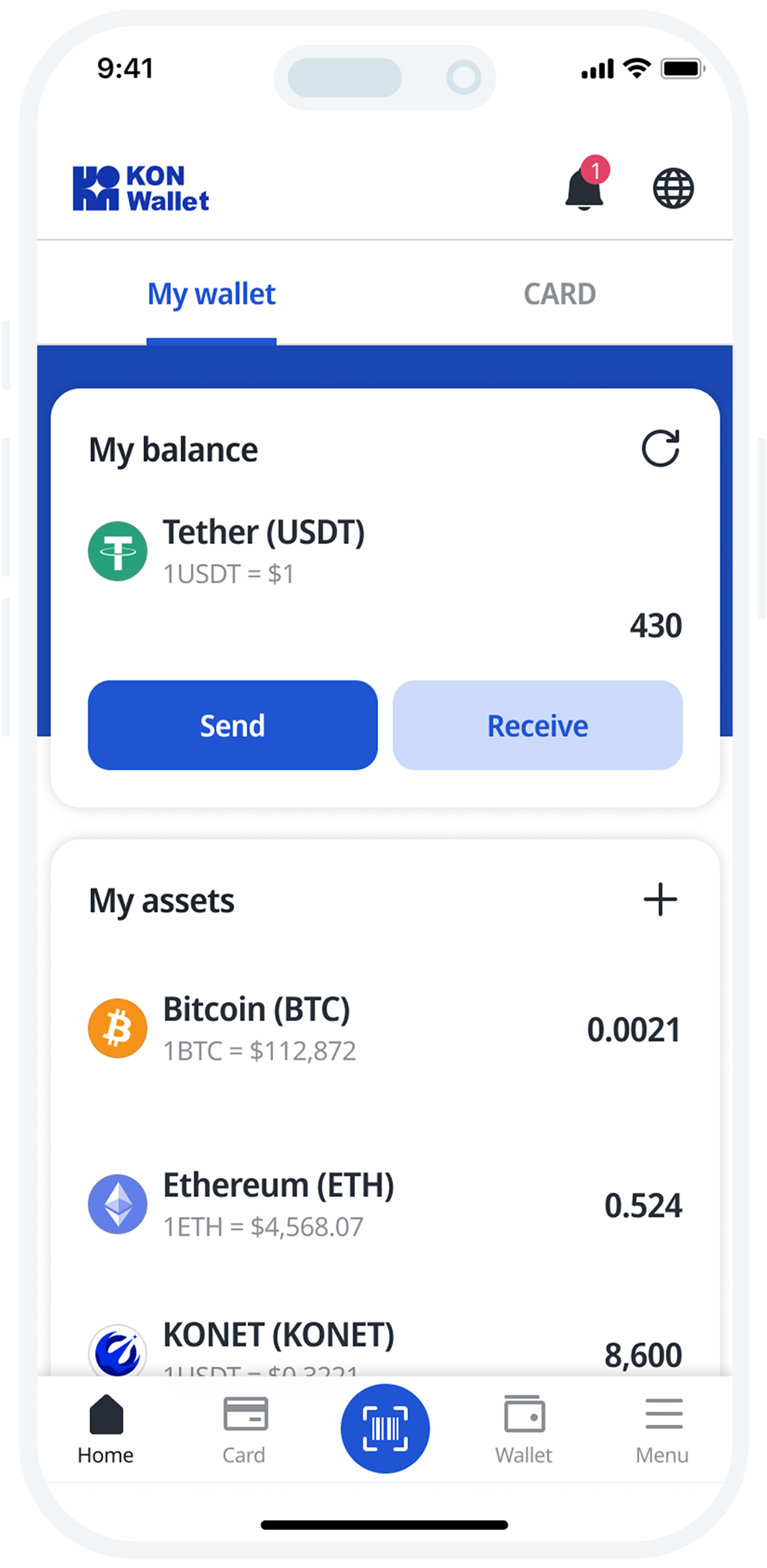 KONWallet is a digital asset custody and payment platform that seamlessly connects and charges a wide range of digital assets, from Bitcoin and Ethereum to stablecoins. KONWallet enables global payments and ATM withdrawals through Mastercard, and supports digital asset payments at offline merchants via QR, barcode, and NFC.